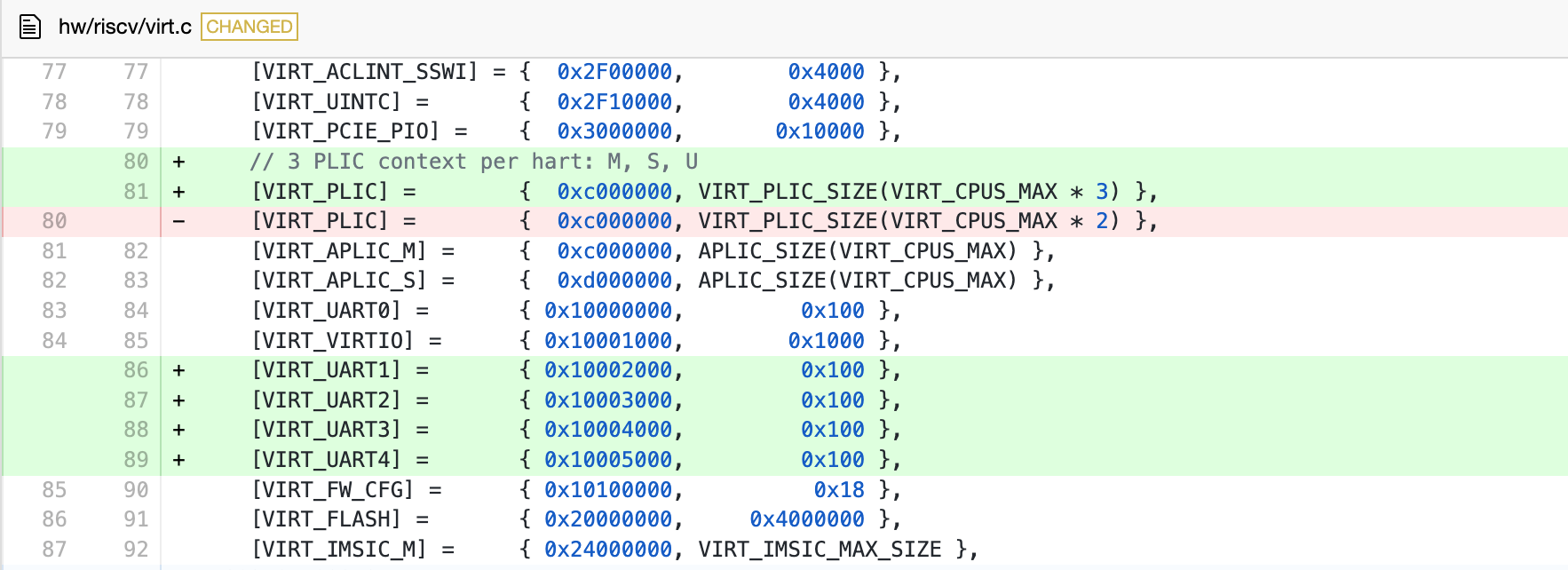 将由于 rCore-Tutorial-v3 的终端已经占用了一个串口用于文字输入输出,为了不影响操作系统的运行状态,eBPF Server 需要用另一个专属的串口来和 GDB 通信。关于给虚拟机添加更多串口,大部分网上的资料仅提到添加一个 Qemu 启动参数,但是经过实际测试后发现这不起作用。原因是Qemu 虚拟机并未支持 RISC-V 平台的多串口收发。因此,我们修改了 Qemu 虚拟机的源代码,为新串口分配了 MMIO 地址和 IRQ(中断号):